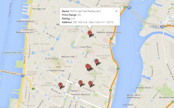 I can plot these restaurants on a map! We have a street map of New York City as the base image, which depicts features such as NYU and Bellevue Hospital Center. I have my restaurant names, prices, and rating in a layer, along with their latitude and longitude. The lat/long determines where the restaurant is on the base map, and we’ll cover how we went from textual address to lat/long in the next section. Finally, I can represent each restaurant with a single-symbol pin graphic. With a little help from digital maps, I’ve went from having a list of restaurants to seeing where I’ll be eating dinner tonight.